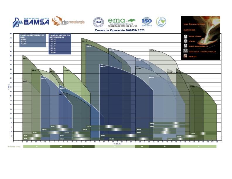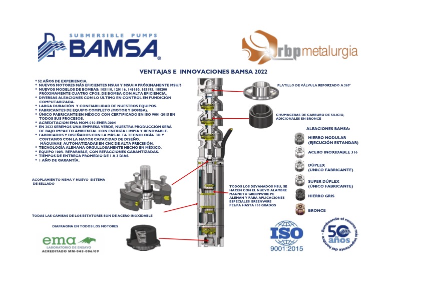 Bombas y motores eléctricos sumergibles marca BAMSA de 1 a 120 lts/seg y de 4 a 350 H.P. para bombear agua de Pozo Profundo